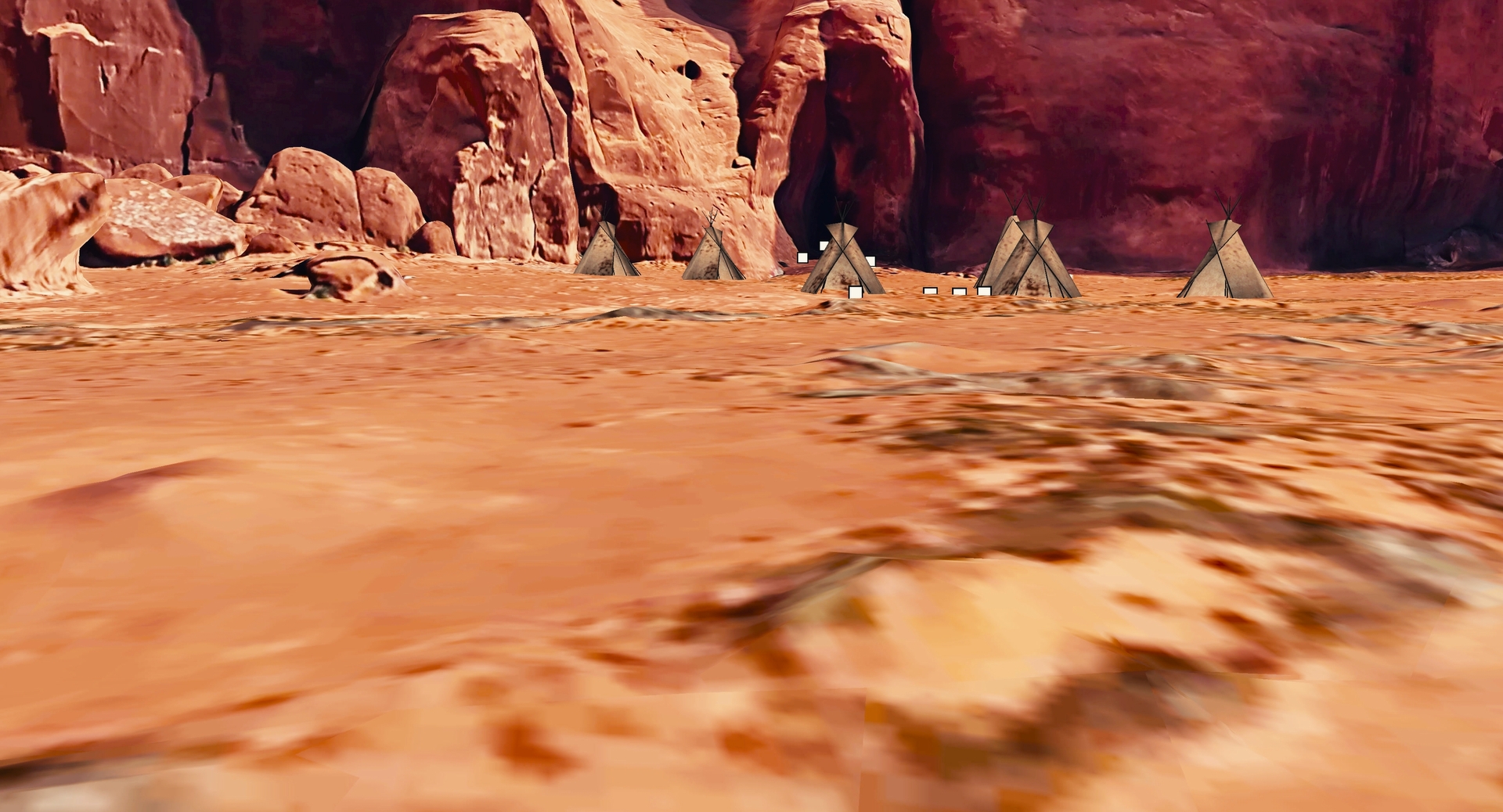 En ouverture, le narrateur indique que les premiers hommes ont été contraints de fuir leur village en raison de l’apparition soudaine d’un immense raz de marée. Cette séquence s’intéresse au déluge tel qu’il est représenté dans la Diné Bahane’, le récit originel navajo. Ensuite, ce mythe est recontextualisé au regard d’un événement qu’a vécu John FORD en 1915 lorsqu’il était assistant-réalisateur pour une société de production hollywoodienne. À cet instant, la diégèse du court métrage se trouble en raison de la superposition d’éléments narratifs constitutifs d’œuvres dont les enjeux politiques et culturels varient. Par conséquent, les premiers hommes font face à des situations tirées, par exemple, du film The Searchers (1956) réalisé par FORD. C’est à travers ces allers-retours diégétiques que les personnages découvrent lors de leur exode, les raisons pour lesquelles leur pays a subi une inondation massive. Pour échapper aux eaux tumultueuses, les protagonistes ont creusé une fente dans la coquille formée par le ciel. D’après la Diné Bahane’, le tunnel a mené les personnages dans un nouveau monde. Il s’agit du monde dans lequel vivent actuellement les Navajos.