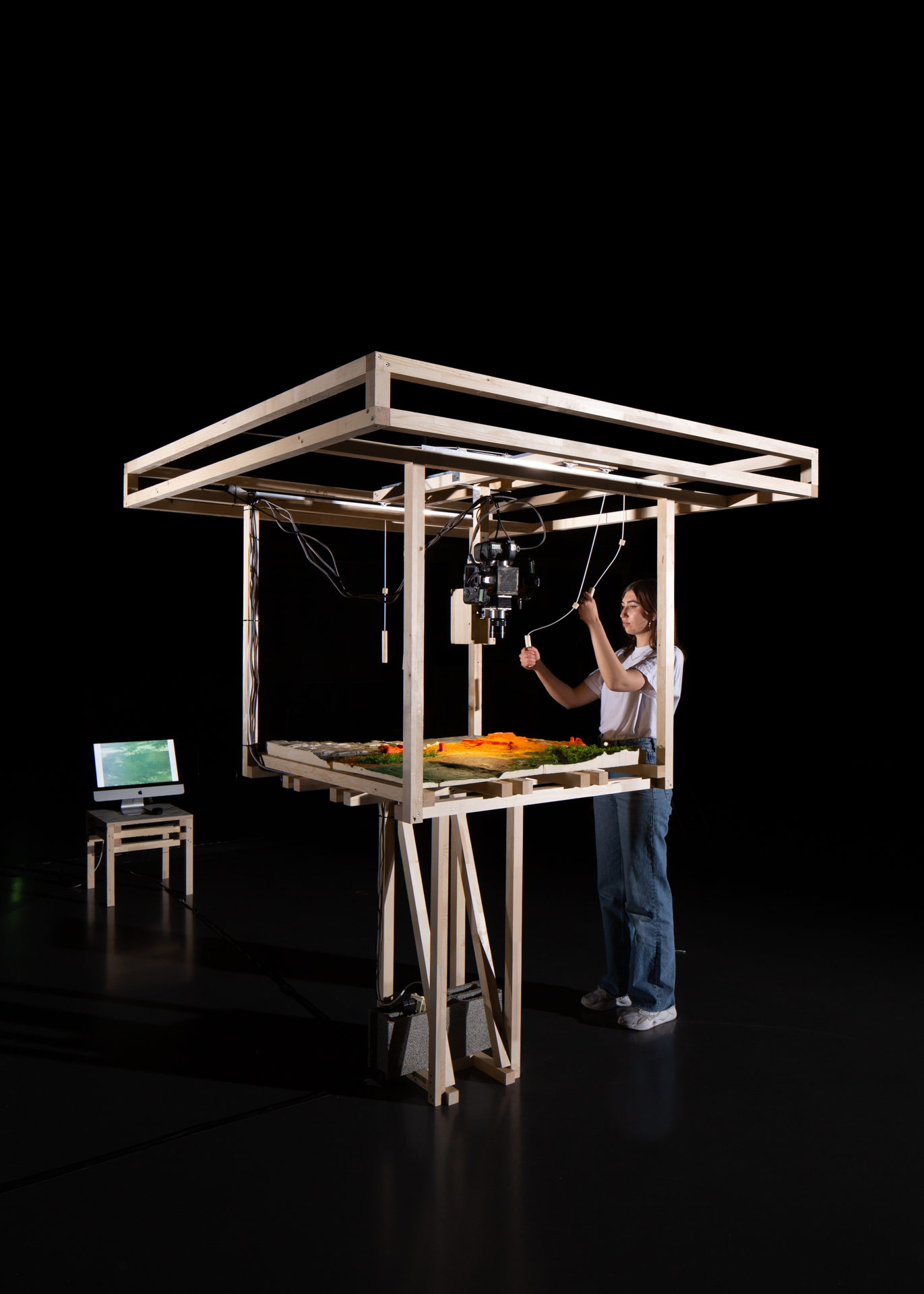 À quelques mètres de l’écran, une structure intègre un dispositif de prise de vue disposé pour filmer en plongée, un diorama représentant le terrain de la simulation. Ce système peut être actionné par le spectateur à l’aide de cordes. Cette installation permet d’expérimenter de manière ludique la prise de vue verticale du paysage si représentative des technologies de surveillance aérienne. Celles-ci sont devenues un certain standard à la fois scientifique, tactique et documentaire pour représenter des territoires inaccessibles.